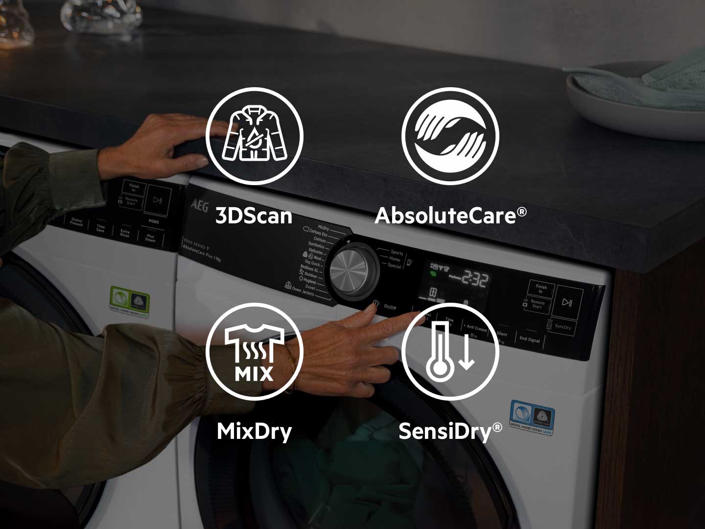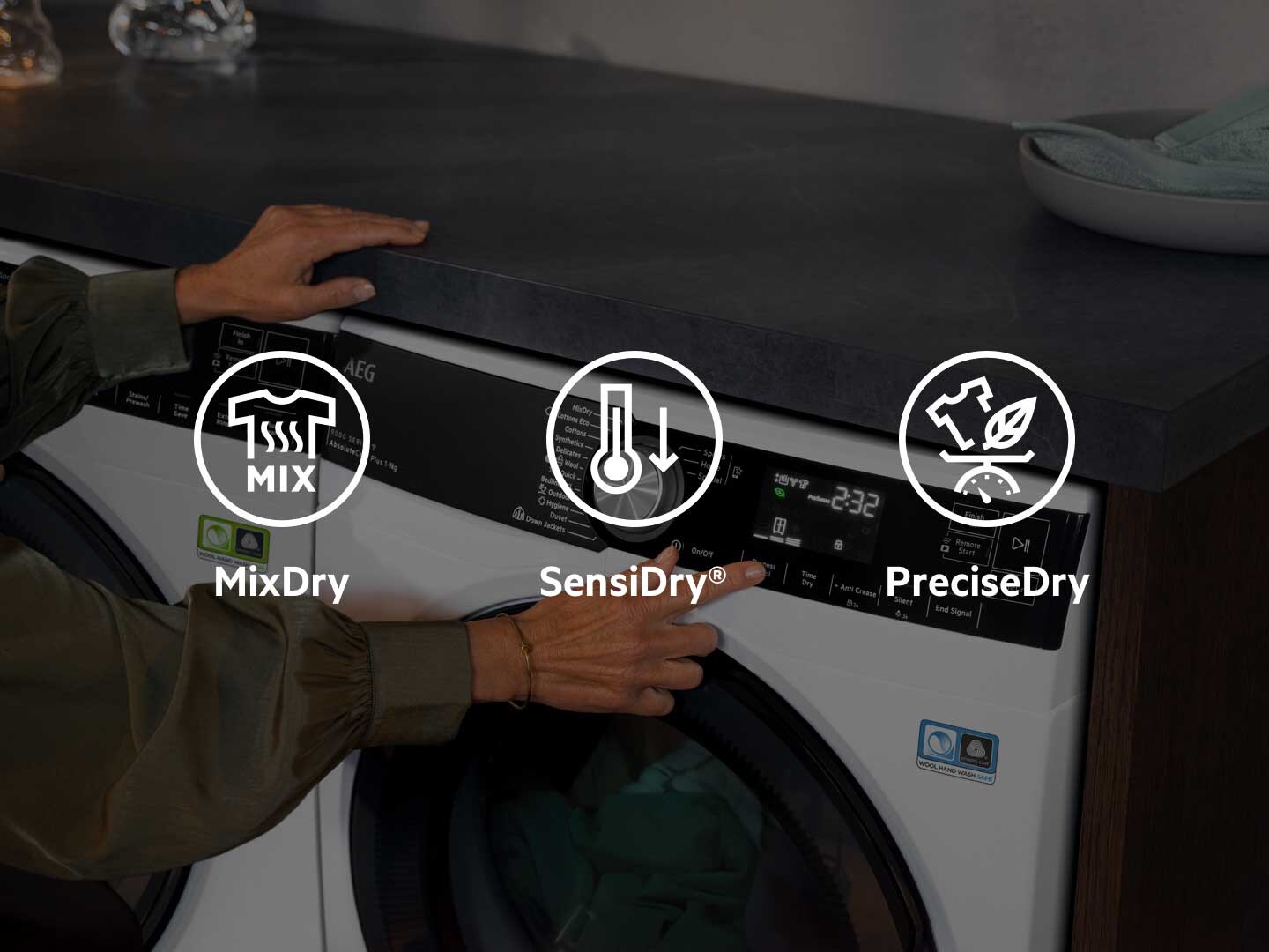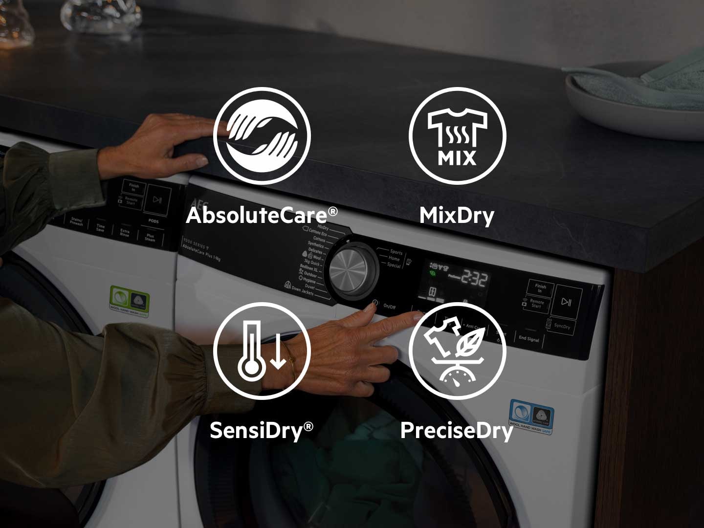 AbsoluteCare® uporablja tehnologijo toplotne črpalke, skupaj z natančnimi gibi bobna in temperaturami za varno sušenje vaših oblačil, tudi občutljivih kosov. Zagotavljanje, da se volna ne skrči in svila ne izgubi oblike. Obnavlja zaščito pred vodo za oblačila na prostem in ima certifikat Woolmark Blue.