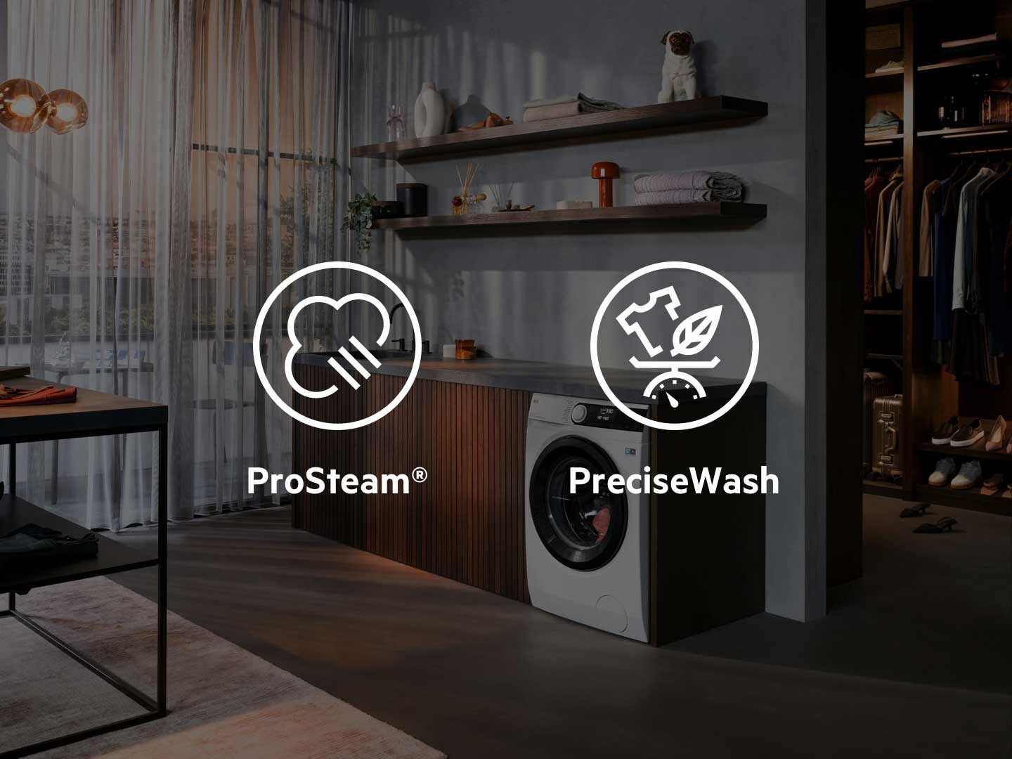 ProSteam®: *Interni test z obremenitvijo 1 kg na parnem programu v primerjavi s programom za občutljivo perilo. **Zunanji test je pokazal nevtralizacijo vonja po cigaretnem dimu v ciklu osveževanja s paro.
