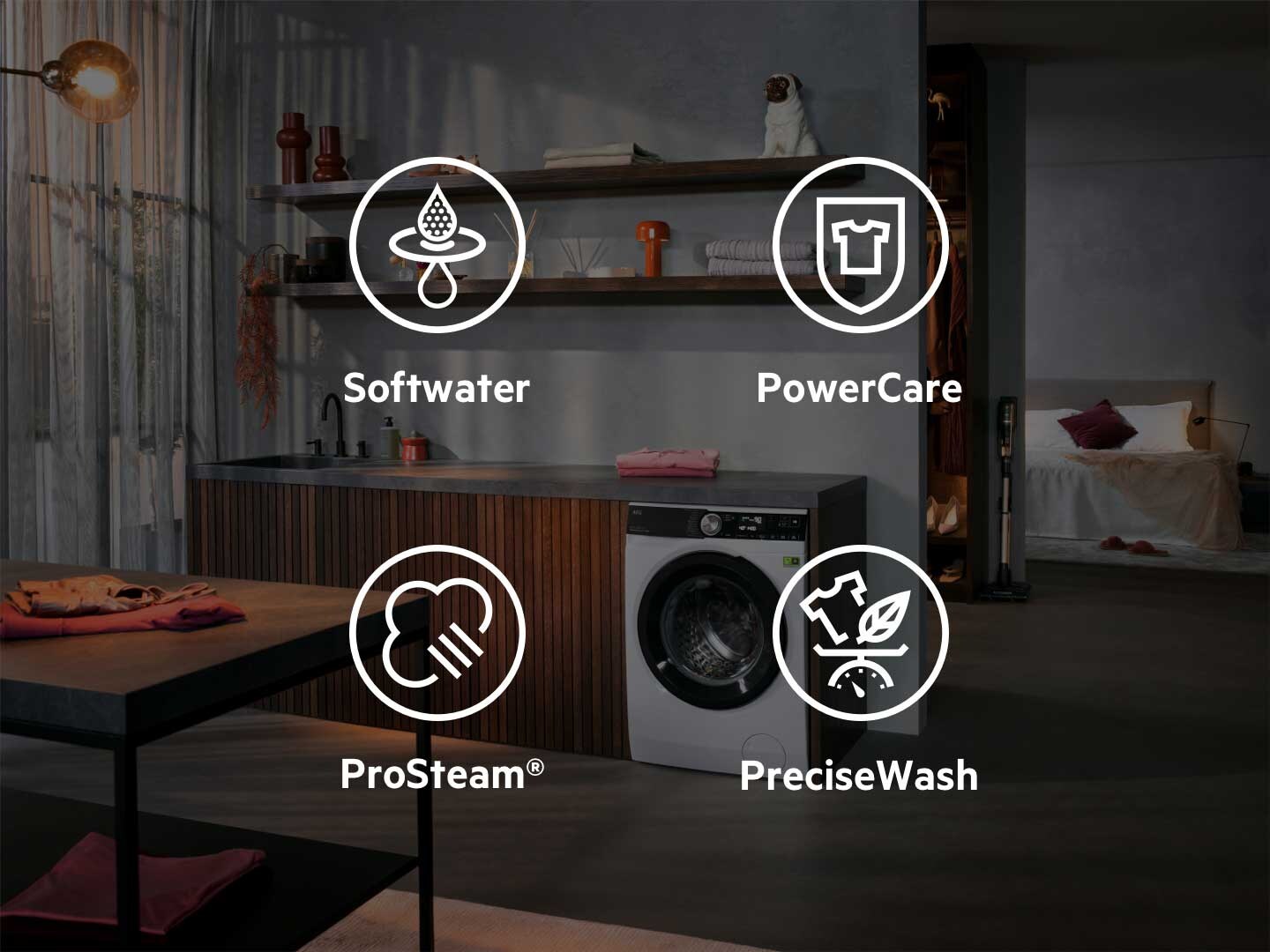 Zavrnitve odgovornosti: AbsoluteCare® s tehnologijo SoftWater: *Zunanji preizkus barvne obstojnosti na črnem poliestru po 50 ciklih pri 30 °C s tehnologijo Softwater **Notranji test kaže manjše krčenje na več bombažnih tkaninah, opranih s tehnologijo SoftWater s trdo vodo v ciklu bombaž, v primerjavi z nefiltriranimi trda voda.