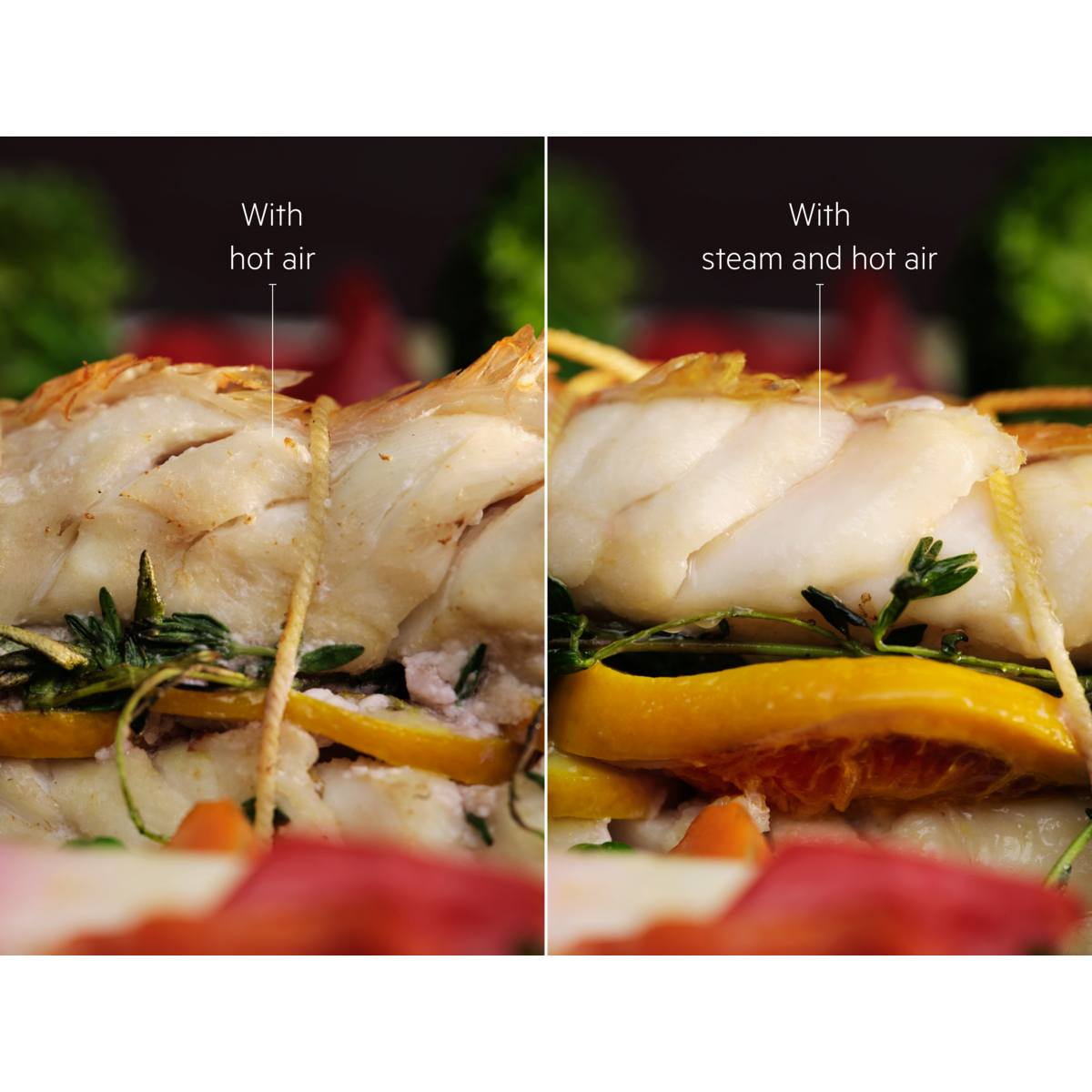 S 6000 SenseCook® pečico s SteamCrisp® odlično specite vrhunske jedi. S kombinacijo pare in običajnega načina peke je meso bolj sočno, ribje jedi pa do 20 % mehkejše v primerjavi s pečico brez pare.
