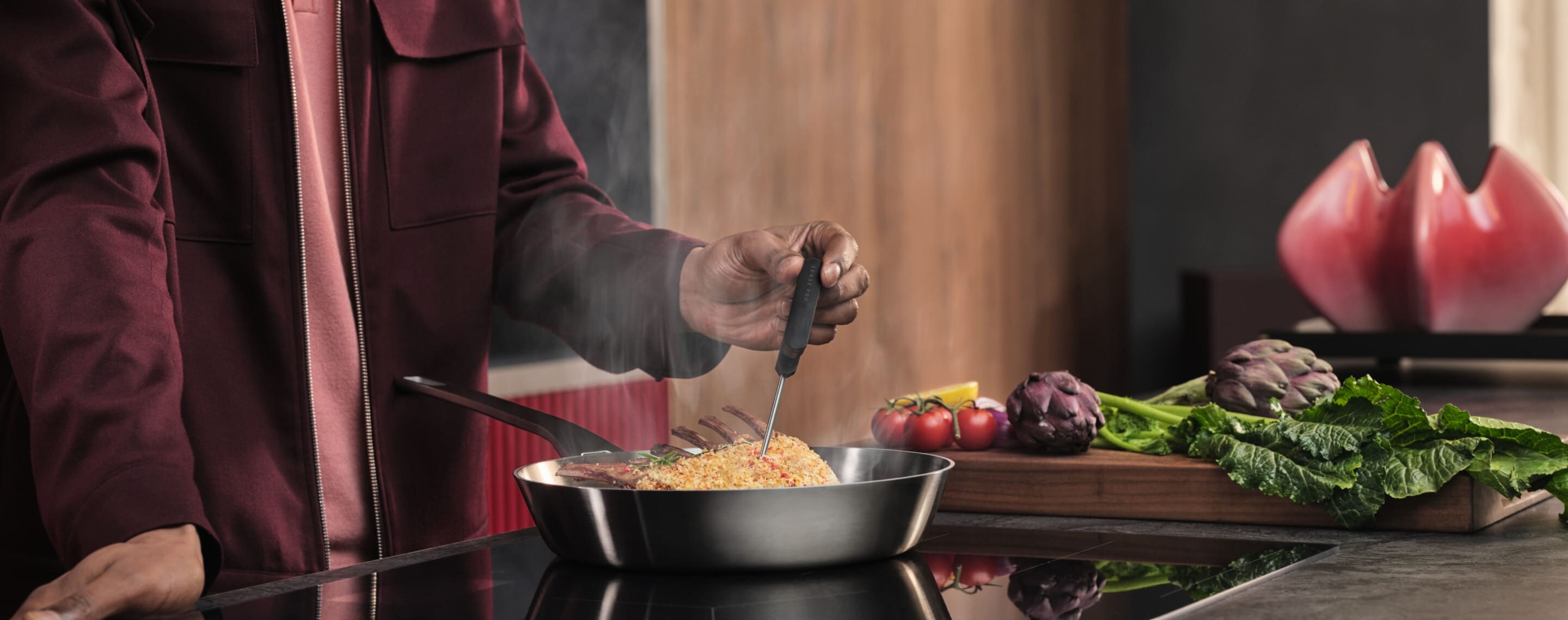 Brezžična sonda za hrano natančno meri središčno temperaturo in samodejno prilagaja nastavitve kuhalne plošče za popoln okus in teksturo. Popolna rešitev za kuhanje, cvrtje in tehniko sous vide.