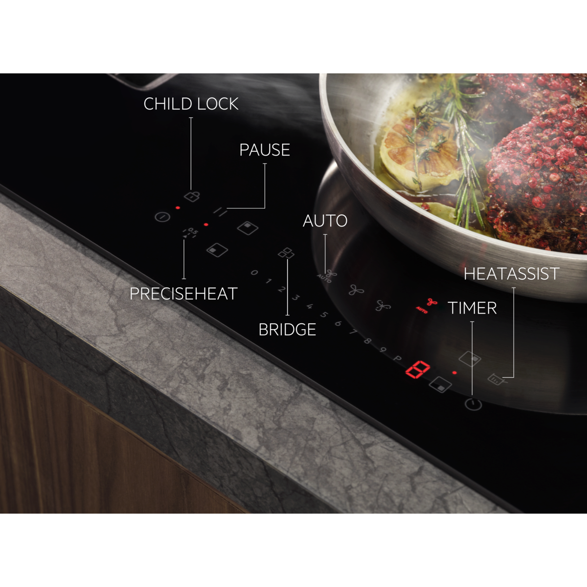 Funkcija Bridge vam omogoča, da združite dve ločeni kuhalni površini v eno veliko in s tem po celotni površini enakomerno porazdelite toploto – odlično za večje lonce ali plošče za žar.