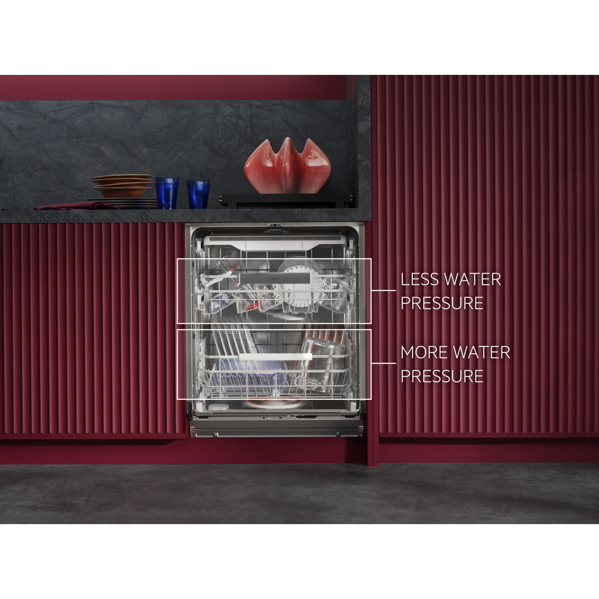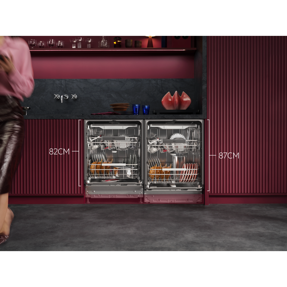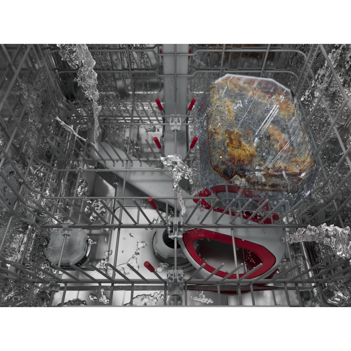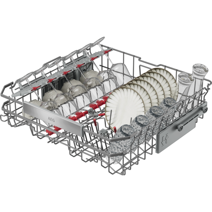 8000 XXL: 5 cm višji v notranjosti, vendar se prilega standardnemu kuhinjskemu pultu. S temeljitim pomivanjem odstrani zapečene ostanke hrane. Vsestranske košare z zložljivimi predeli in držali za kozarce. Visoko učinkovit vodni sistem porabi le 8,4 litra vode.
