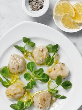 2 Semena in lupinico zmešajte z oljem in vakuumsko zaprite skupaj s pokrovačami v vrečko SousVide. Pazite, da so pokrovače razporejena v enakomernem sloju, ena zraven druge.